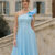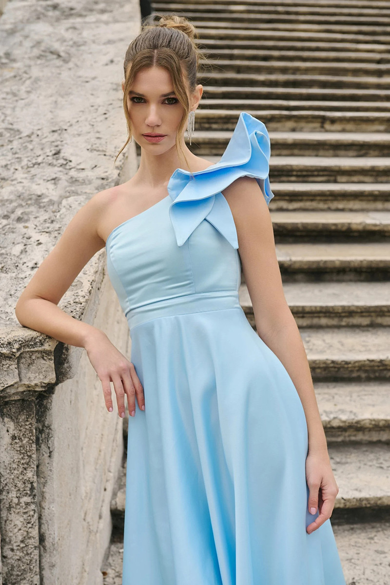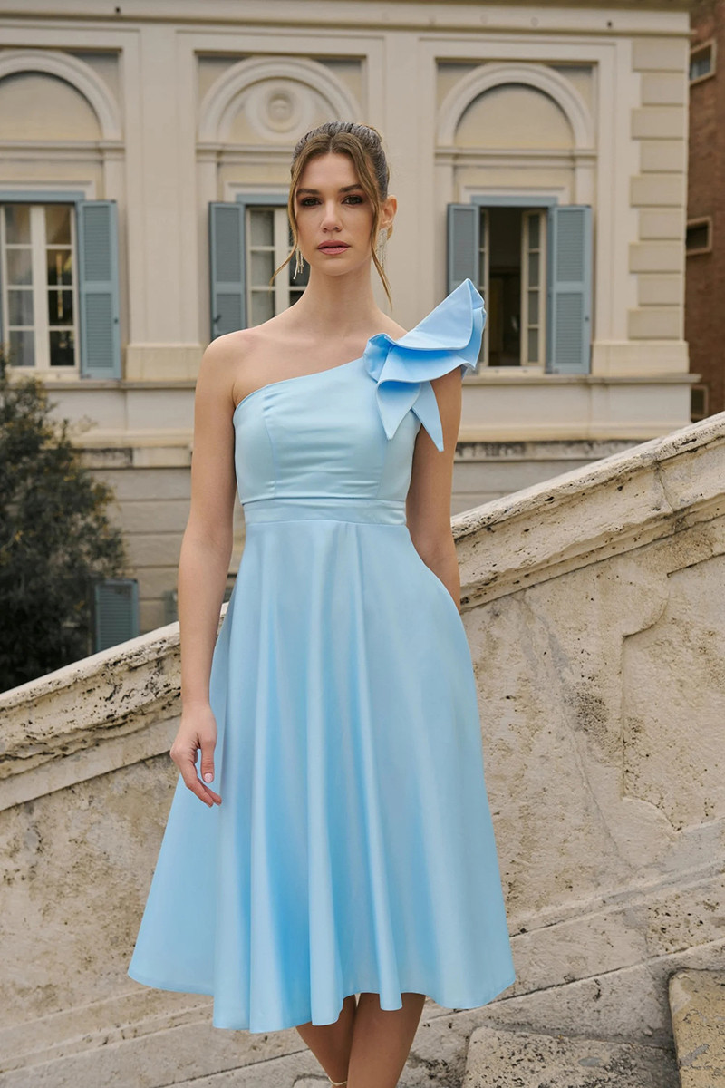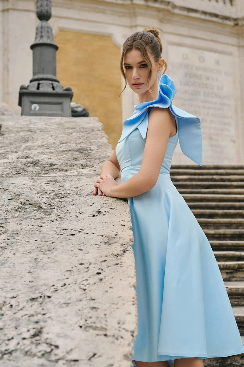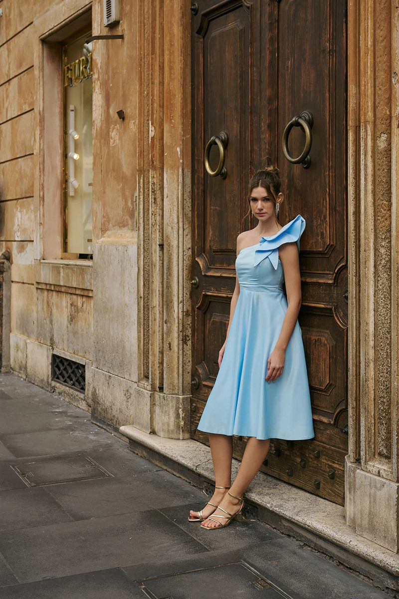 - Midi φόρεμα από ύφασμα κρεπ σατέν σε απαλό light blue χρώμα.