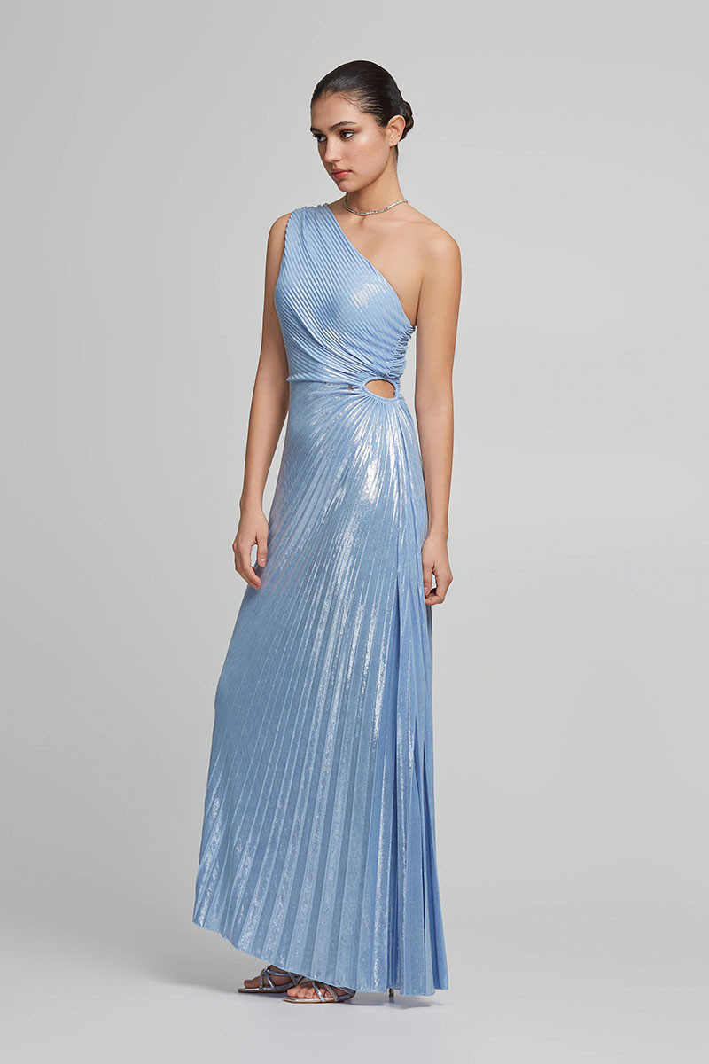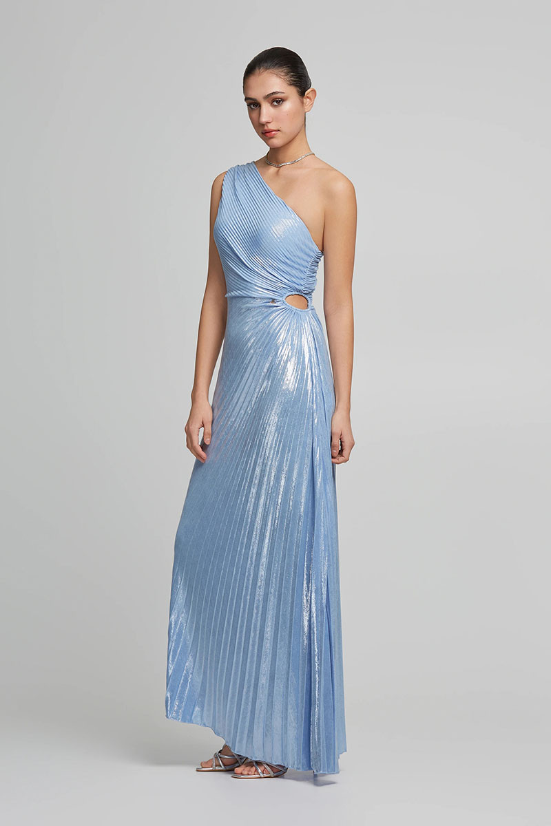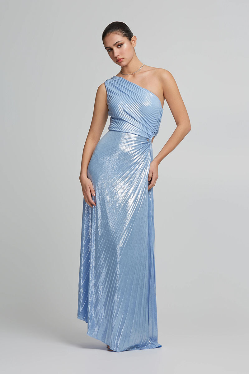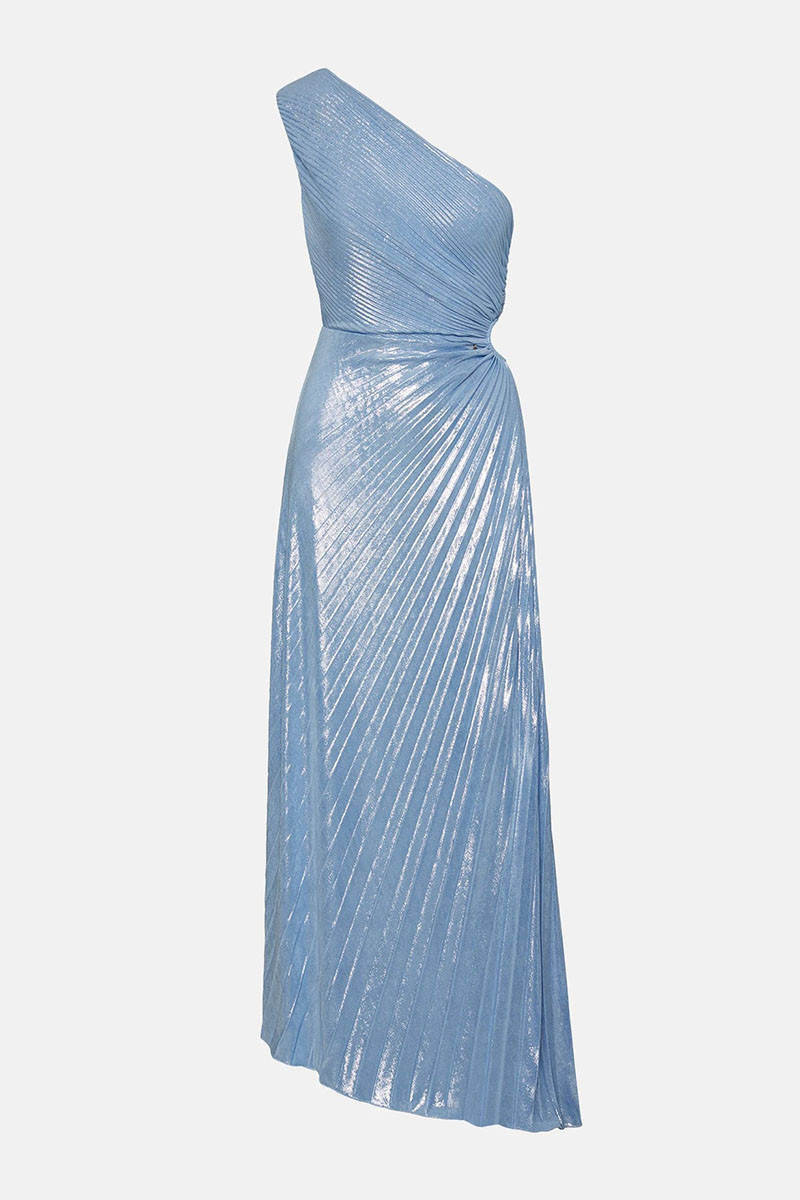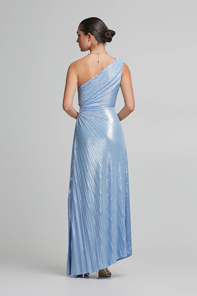 - Μάξι πλισέ φόρεμα με λοξή ραφή και έναν ώμο σε μεταλλιζέ όψη