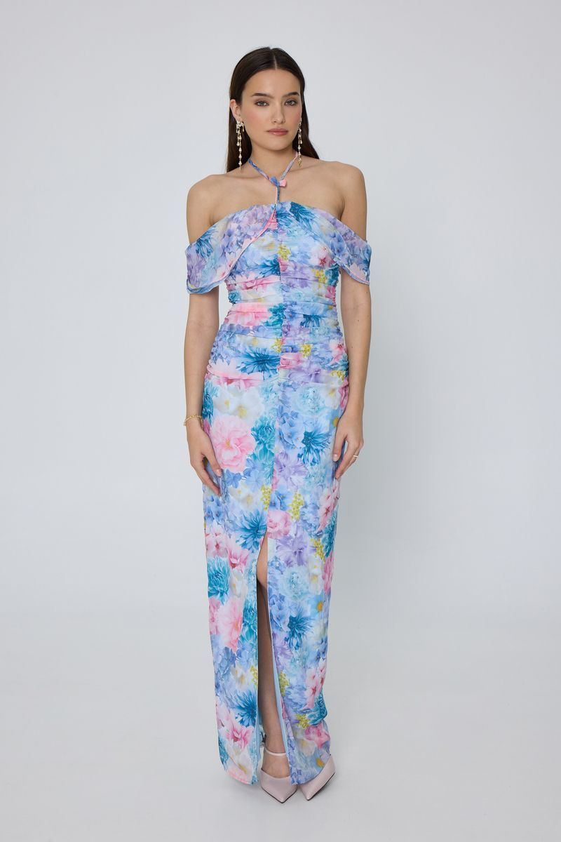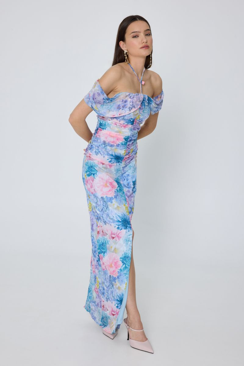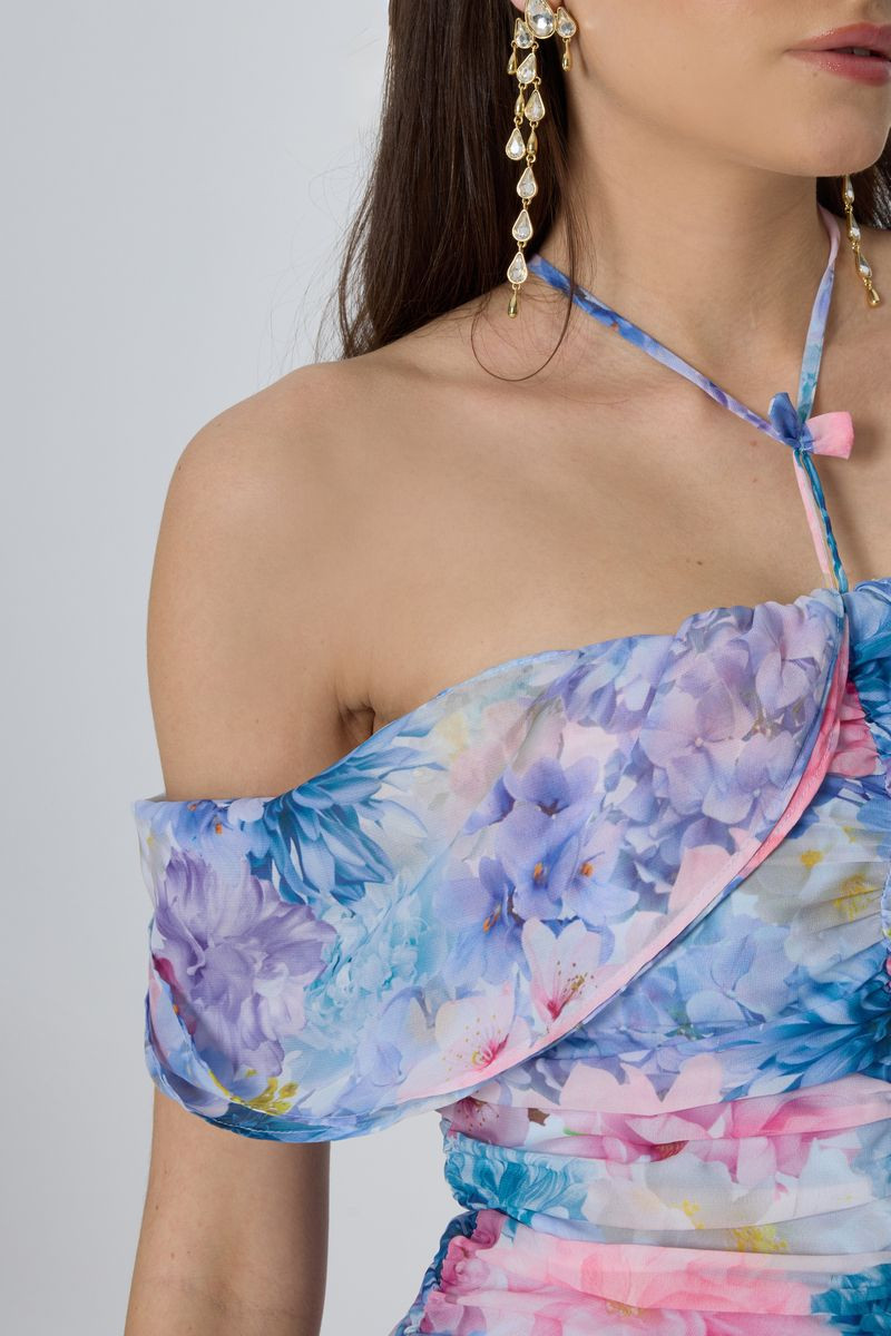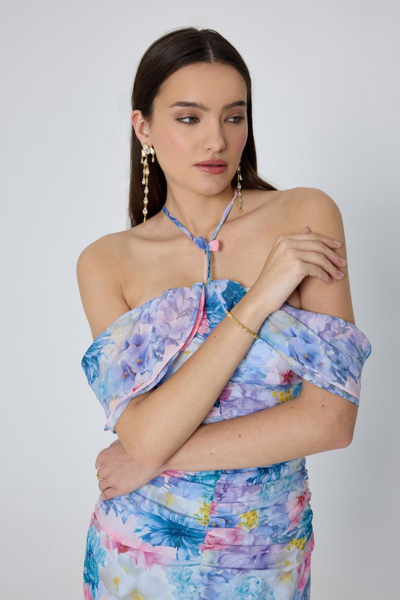- Τυπωμένη φλοράλ μουσελίνα: Ανάλαφρη και αέρινη υφή, χαρίζει ρομαντική διάθεση και κίνηση στο ρούχο. Κολακευτικό ντραπάρισμα στο κορσάζ: Αγκαλιάζει απαλά το σώμα, τονίζοντας τη σιλουέτα και προσφέροντας θηλυκή εφαρμογή.
